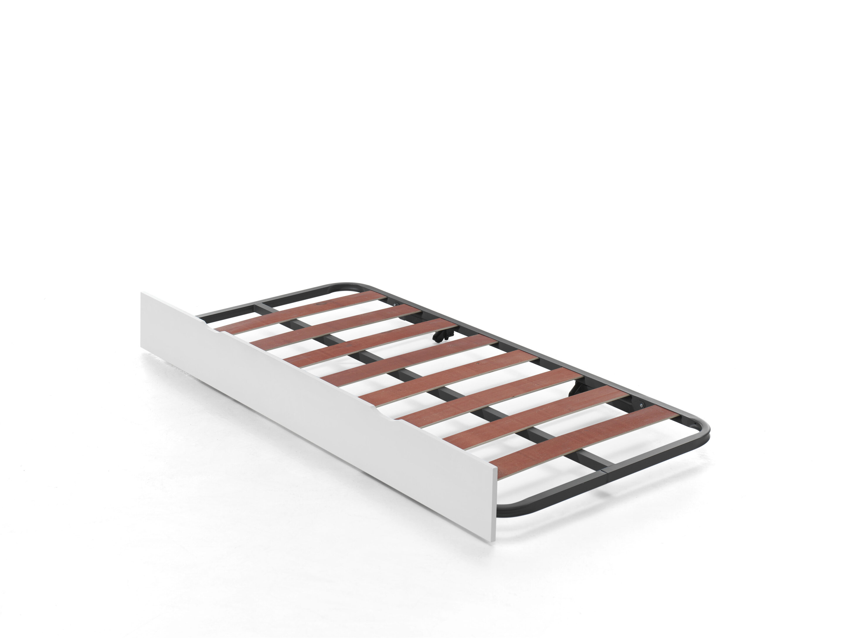 Cajón con somier metálico elevable que se abre en segundos para tener una cama extra cómoda. Frente blanco con uñero, patas abatibles y deslizamiento suave para guardarlo bajo la cama principal. Fabricado en España. Orden, practicidad y buen diseño en un solo gesto.
