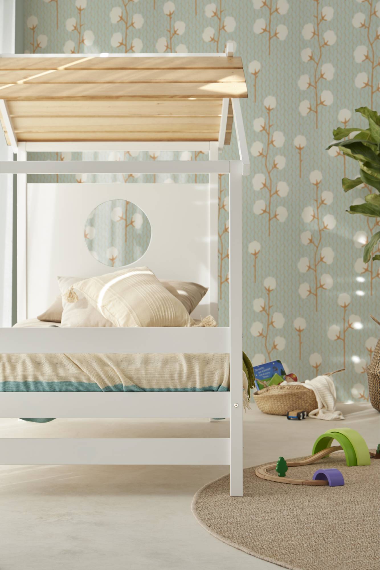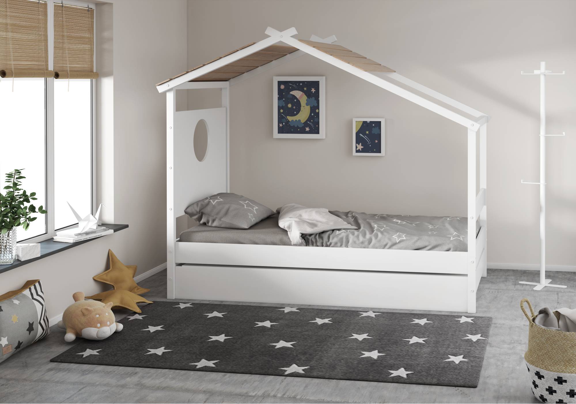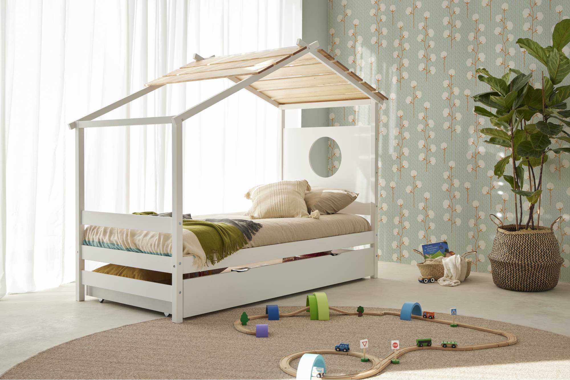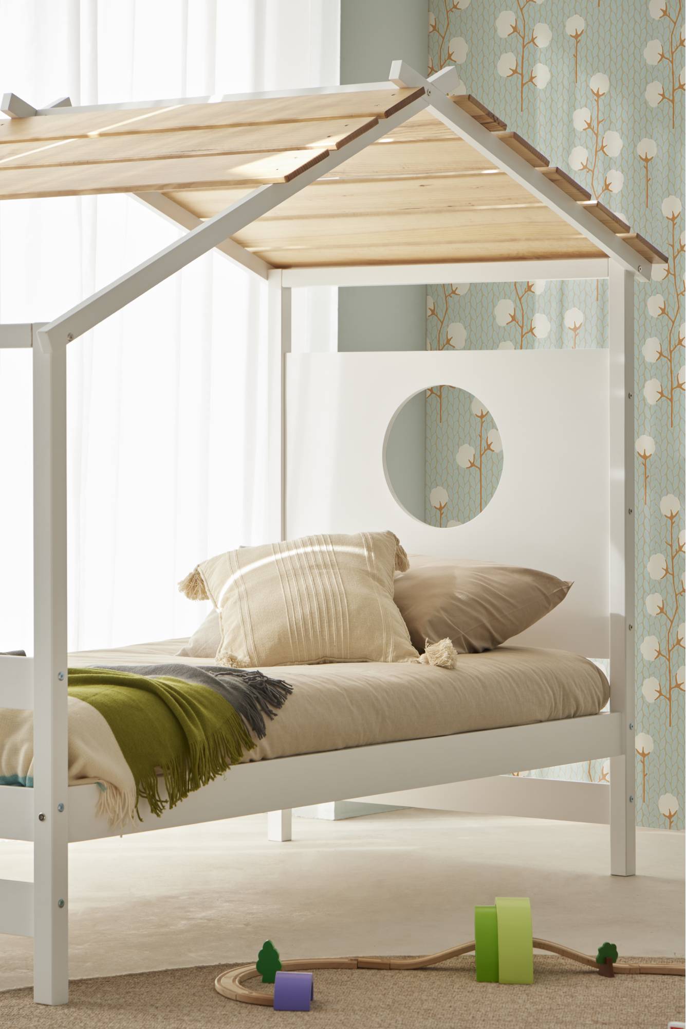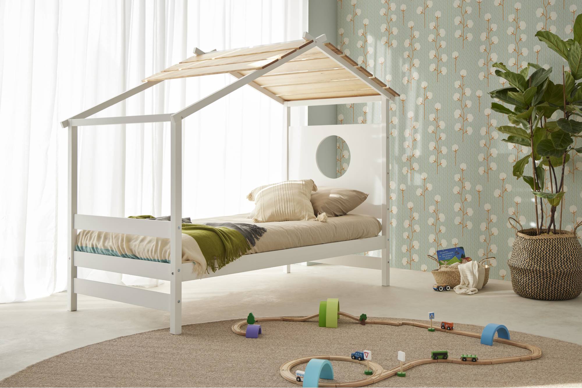 Una cama que invita a soñar y jugar. Con su forma de casita y su techo de madera natural, crea un rincón mágico donde descansar se vuelve parte de la aventura.