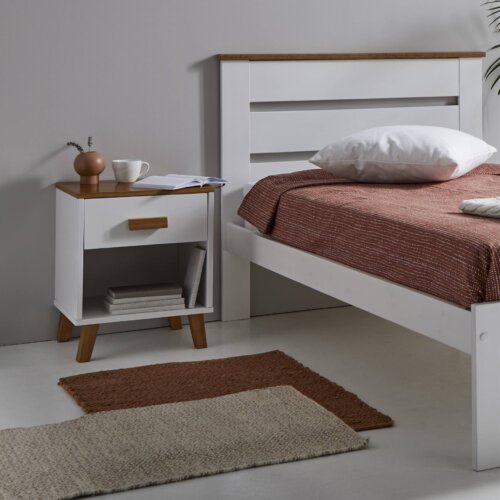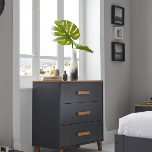 Líneas limpias, blanco mate que combina con todo o azul cielo para iluminar. Patas de madera que dan ese toque cálido. Tres cajones con apertura suave para tenerlo todo a mano. Fabricación española y materiales responsables. Una cómoda serena y práctica que encaja en cuartos infantiles y juveniles.