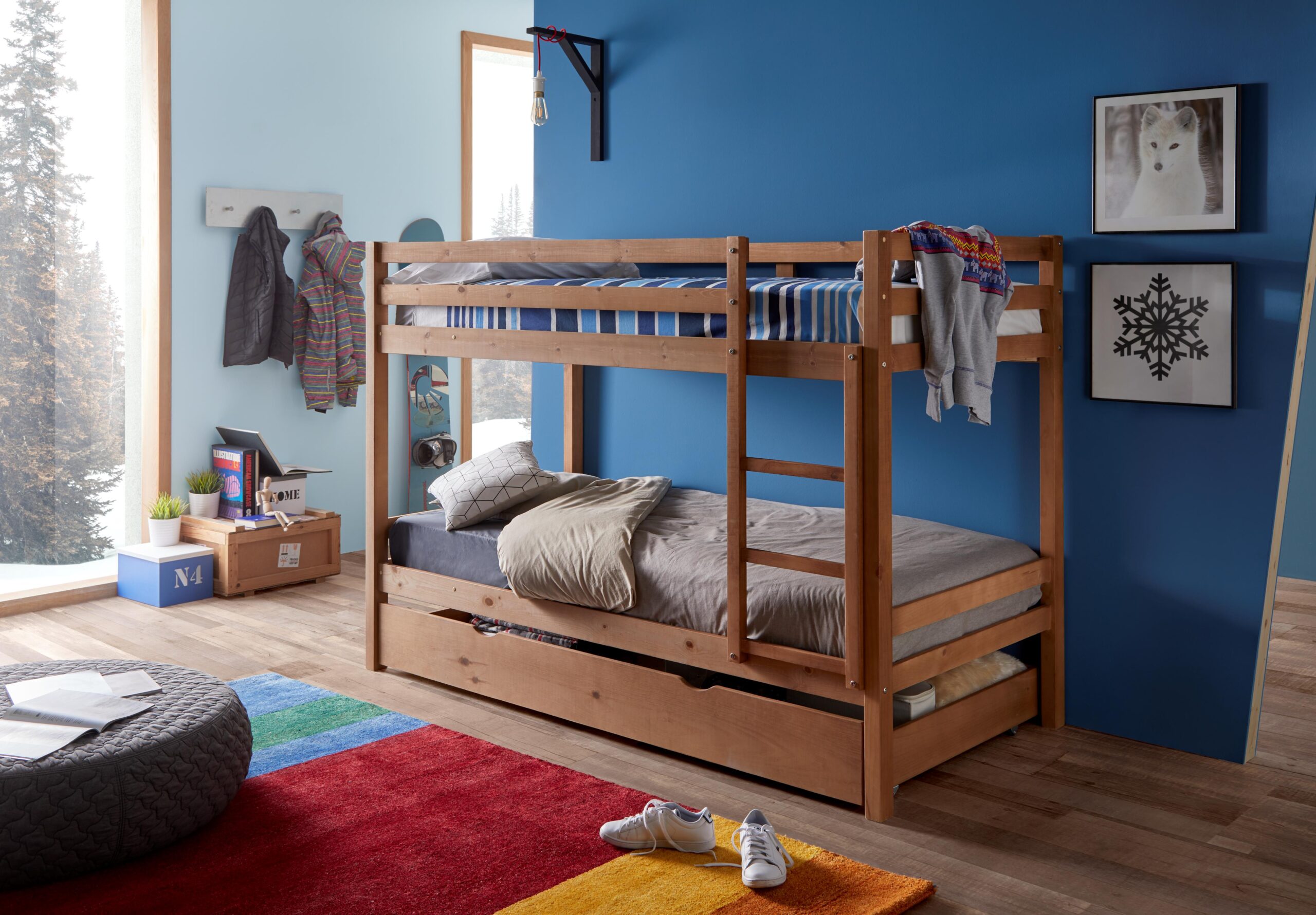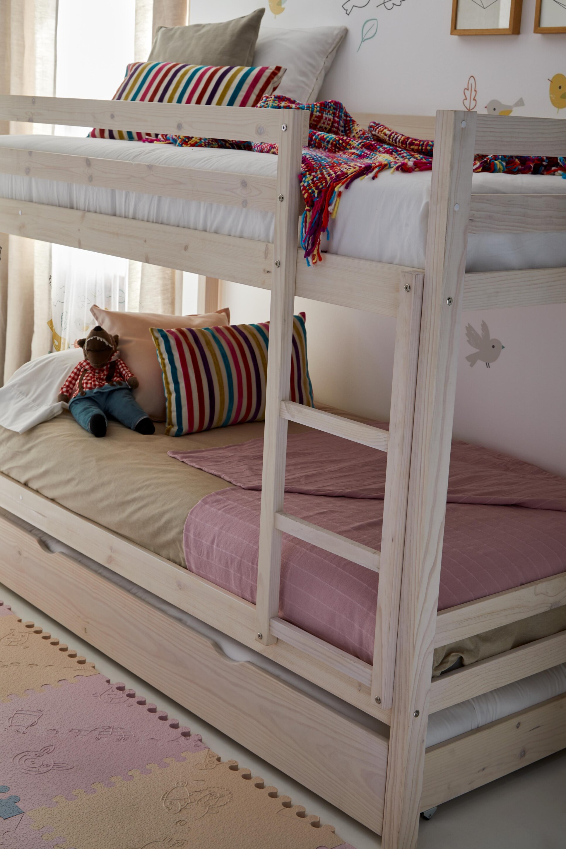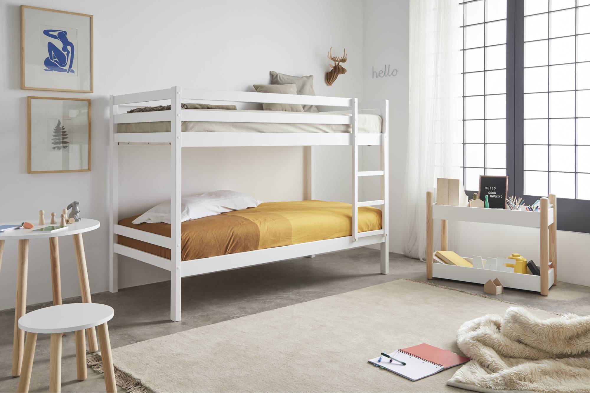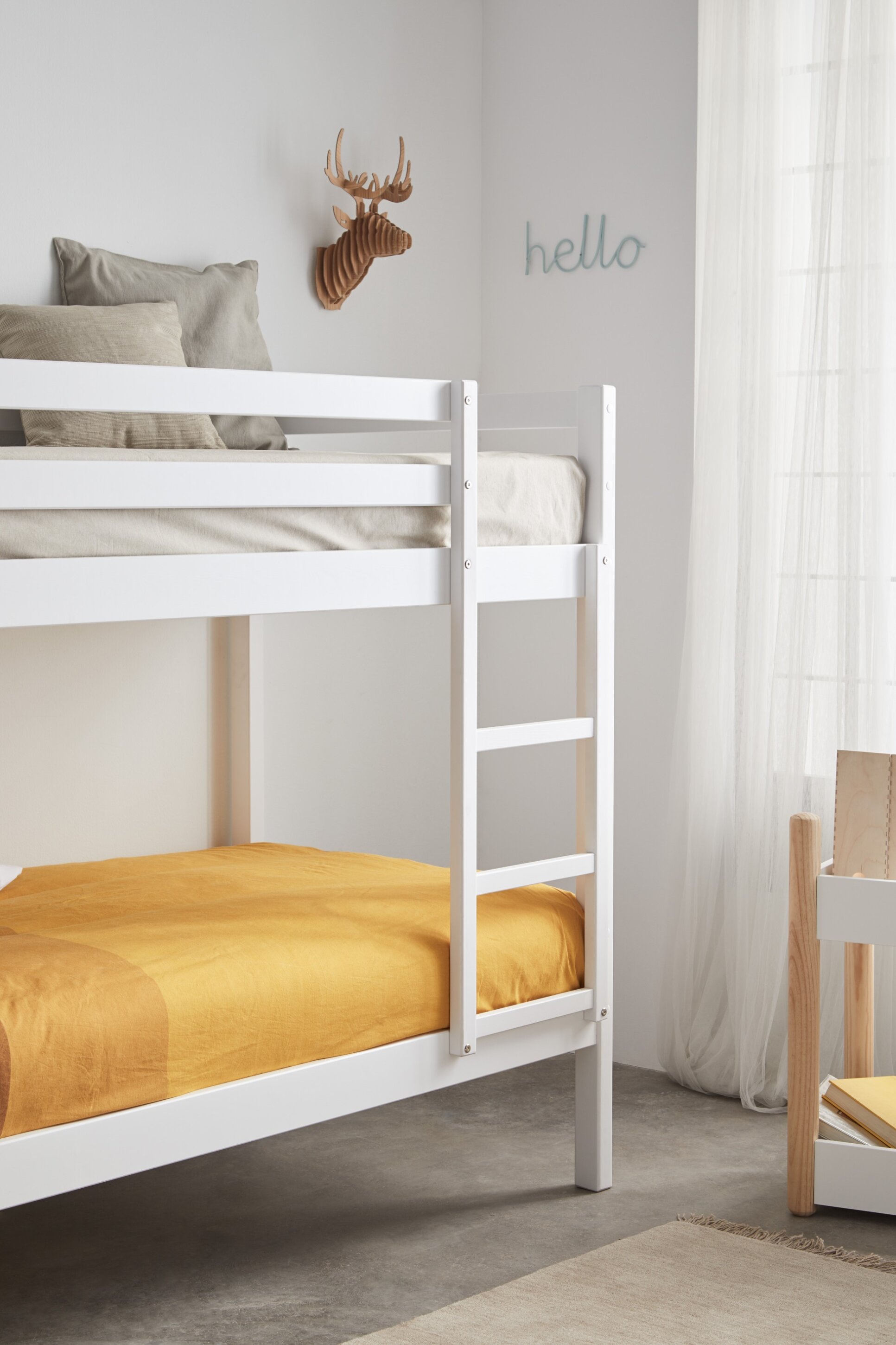 Nuestra litera que despeja el cuarto y multiplica momentos: dos camas firmes, barandillas que abrazan y escalera cómoda. Estable para el trote diario. Fabricada en España en madera maciza. También disponible en varios acabados. Ideal para habitaciones compartidas o para recibir amigos.