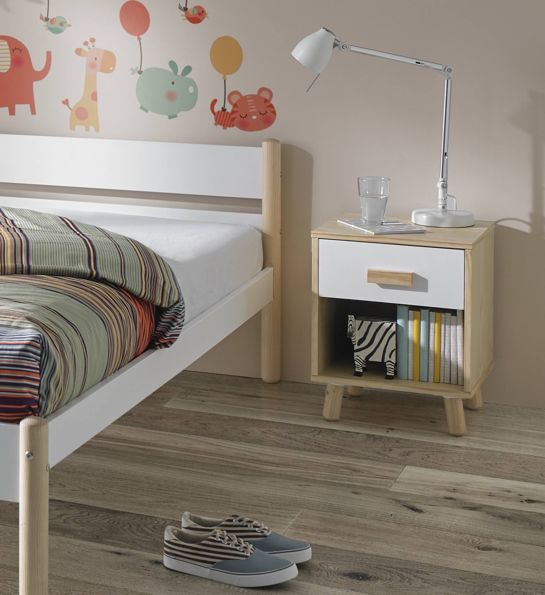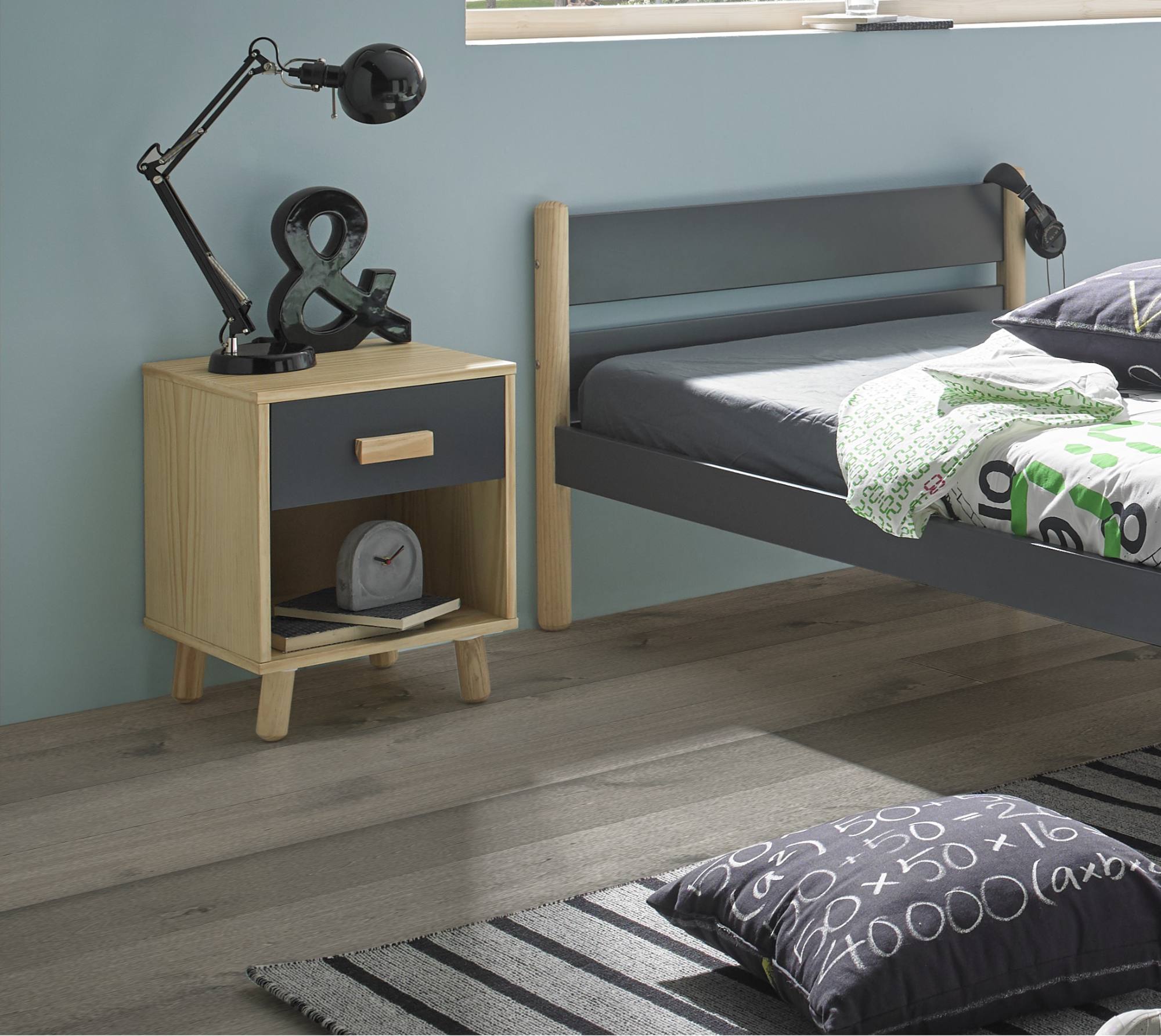 Mesita de noche de pino natural con frente antracita y tirador de madera. Un cajón para lo imprescindible y un hueco abierto para libros o cargadores. Patas altas que facilitan la limpieza y dan ligereza. Fabricada en España. También disponible en blanco.