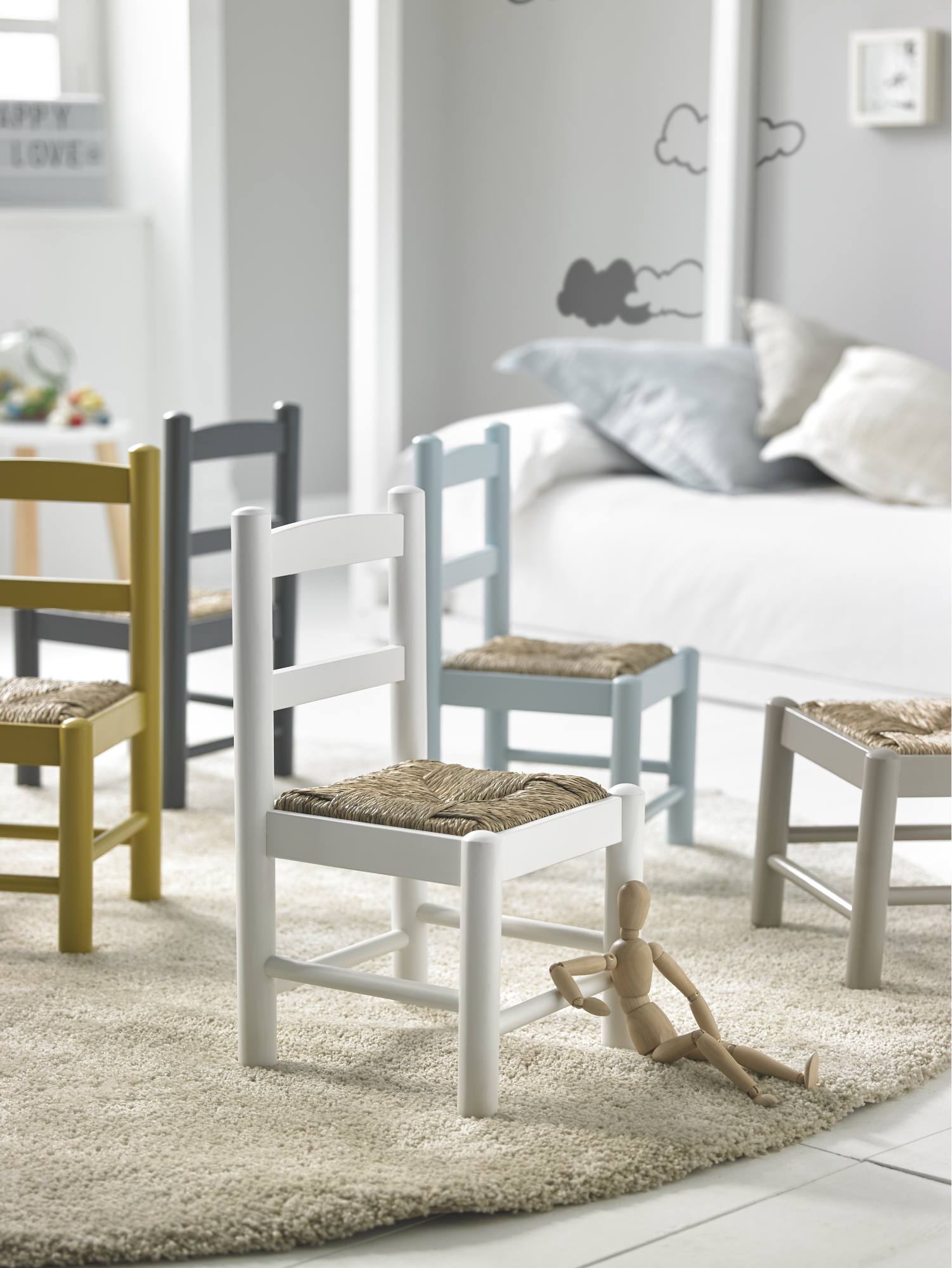 Una silla infantil de madera con asiento de fibra trenzada, ligera y muy estable. Ideal para dibujar, leer o merendar a su altura. Hecha en España con mimo.